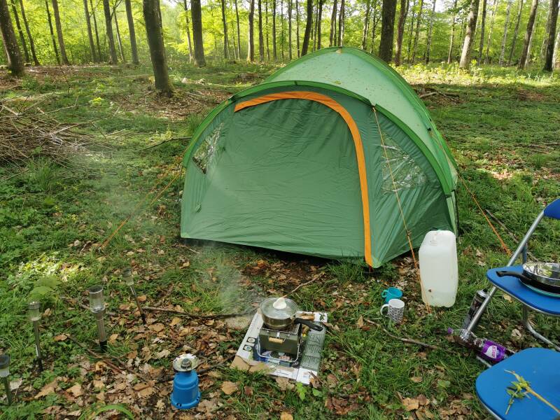 Niet ver van de grens gingen we opzoek naar een goede eerste kampeerplek wat nog niet zo makkelijk bleek te zijn omdat er net over grens heel veel akker land lag en daar mag je natuurlijk niet zomaar je tentje op gaan zetten.