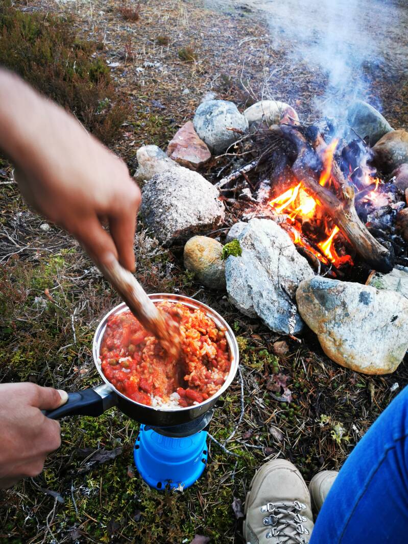 Wij weer snel het tentje opzetten, daar zijn we nu echt goed in geworden, vuurtje maken (ook daar zijn we echt gked geworden) en weer lekker eten in de pan.