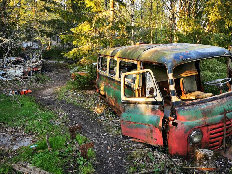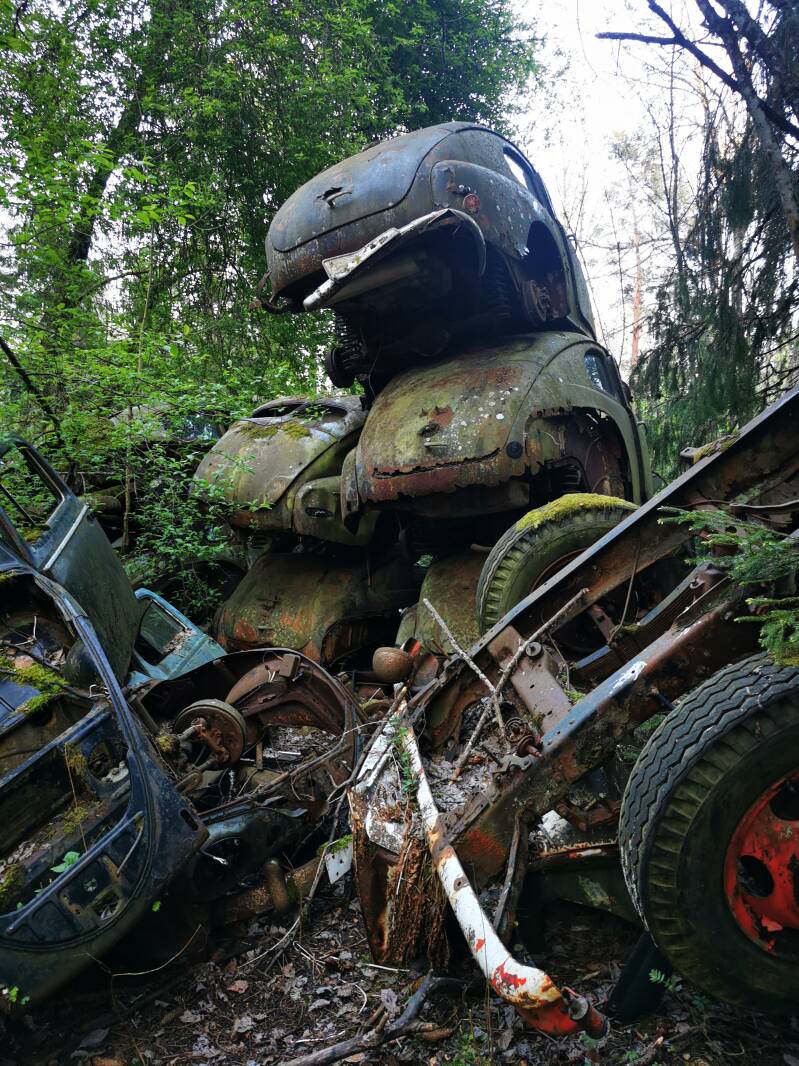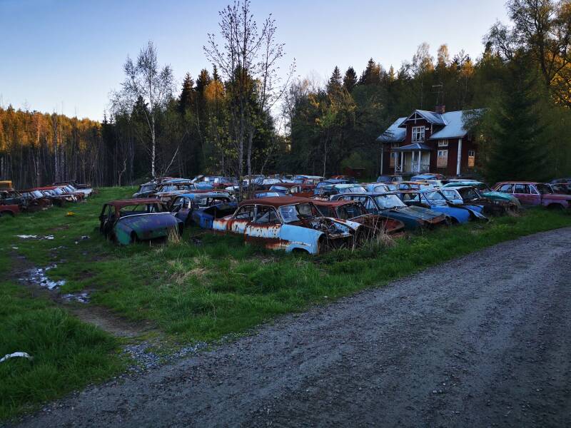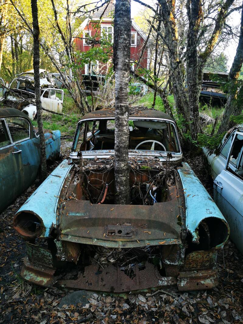 Daarna mochten we gelukkig gewoon verder rijden en de wegen werden ook steeds slechter en we klommen de bergen in opweg naar Båstnäs, een klein plaatsje pal naast de grens van Noorwegen boven in de bergen en bossen. We waren het plaatsbordje nog niet voorbij en zagen de autowrakken al liggen tussen de bomen. Het was een prachtig gezicht maar tegelijkertijd ook griezelig en je kreeg er ook gelijk een heel appart gevoel van, het is niet alleen zonde van de mooie auto's uit de jare 40, 50 en 60s maar je weet dat er een geschiedenis achter zit wat je soms niet helemaal kan plaatsen als je om je heen keek.