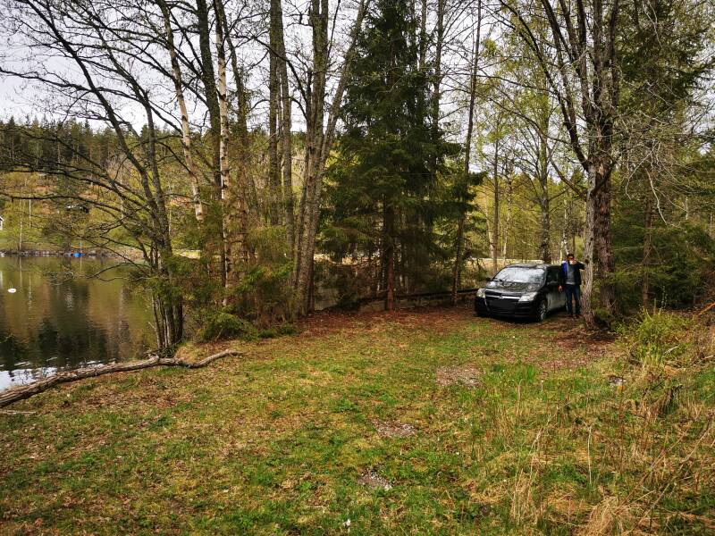 We besloten rustig weer terug te rijden in de hoop dat we ergens toch een inham tegen kwamen wat geen erf is en een beetje uit de buurd van huizen want nog een regel in Zwede is dat je minimaal 150 meter verwijderd moest zijn van huizen en bestrating. We moesten toch wel een aardig stukje terug en we hadden steeds minder hoop totdat we in een keer een goede inham zagen langs de weg aan een meer, het leek er voor gemaakt te zijn om met je auto door heen te kunnen rijden en even te stoppen om te vissen of camperen en ook nog eens geen huizen in de buurd alleen aan de overkant van het meer. Prima.